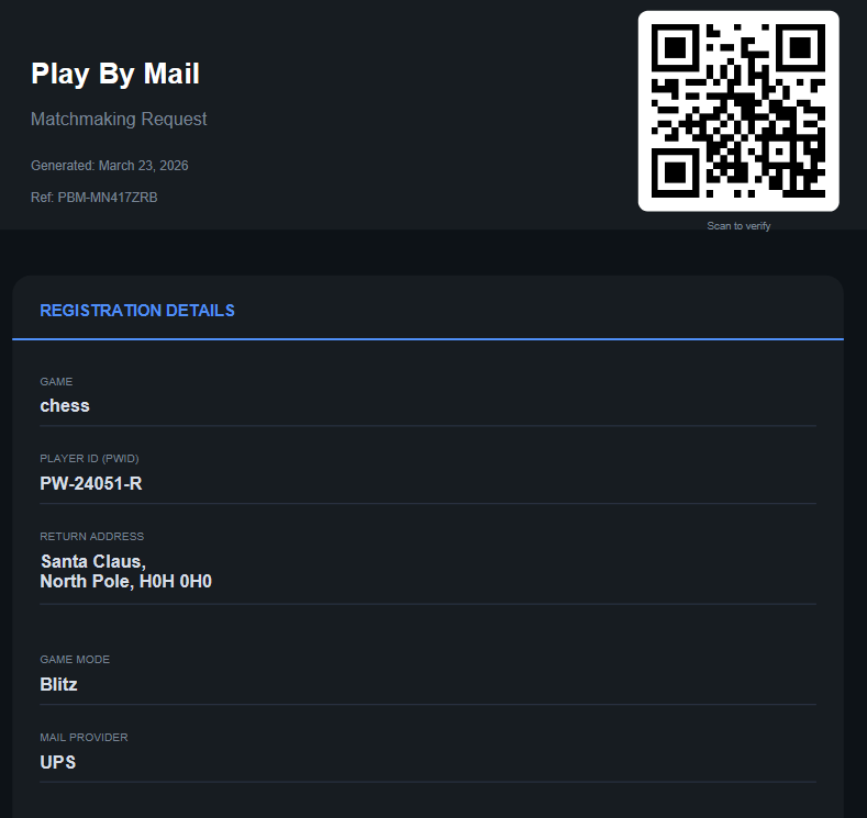 Every player when signing up for play by mail has an account created for them. This account is tied to their PostalWizards ID, or PWID for short. When filling out their matchmaking request form online, a QR code is generated and placed on the bottom of the page. The user then signs the page with their handle, prints it, and sends it in the mail to our central processing location.