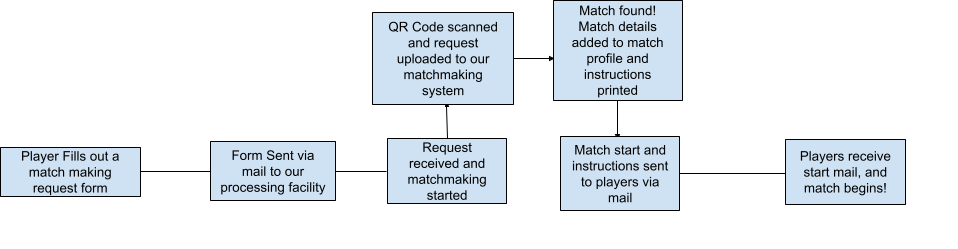 At our processing facility, we open the mail and scan the code, registering the match and pairing them with another player waiting in the pool. When two players are assigned, both players are sent a “MATCH FOUND” image, multiplayer rules and instructions, and the player who goes first receives a first turn card.